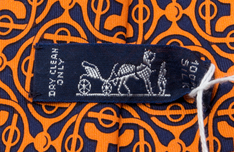navy with an orange geometic motif. Together with a box.Labeled: Hermes.
