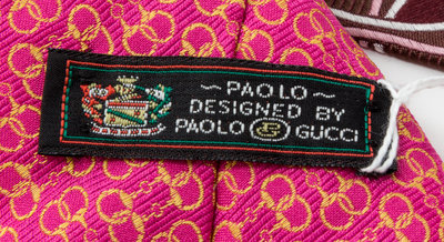 the first a brown Gucci with a geometric motif, the second a pink Paolo Gucci with the horsebit motif and the third a red Valentino with a pink embroidered horizontal pattern.Labeled: Gucci, Paolo Gucci and Valentino.