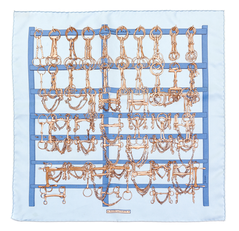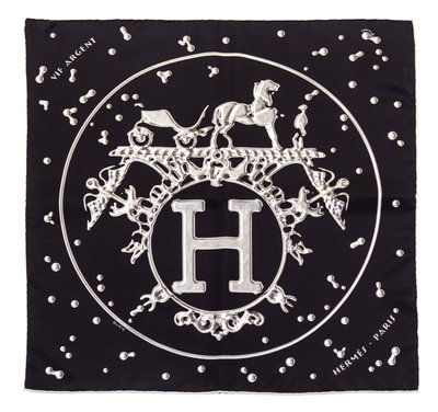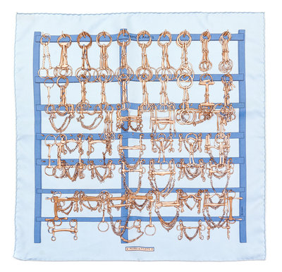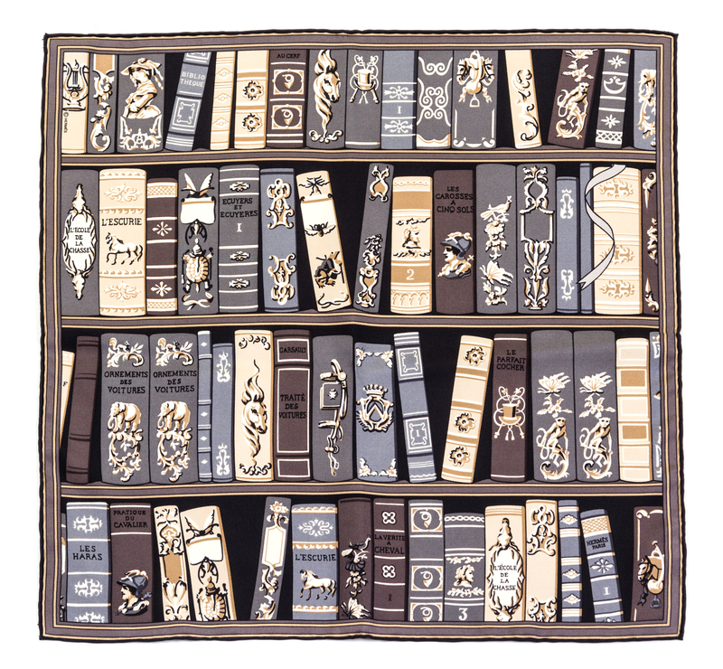 "Bibliotheque" pattern, designed by Hugo Grygkar, "Mors et Filets" pattern, designed by Francoise Heron and"Vif Argent" pattern, designed by Dimitri Rybaltchenko. Together with a box.Labeled within the print: Hermes.