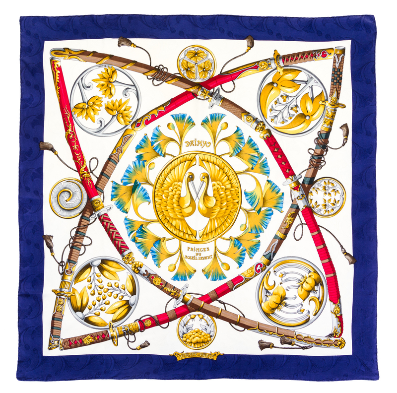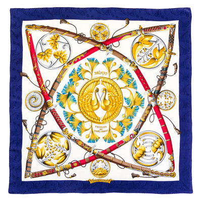 "Daimyo Princes du Soleil Levant" pattern, designed by Francoise Faconnet. Together with a box.Labeled within the print: Hermes.