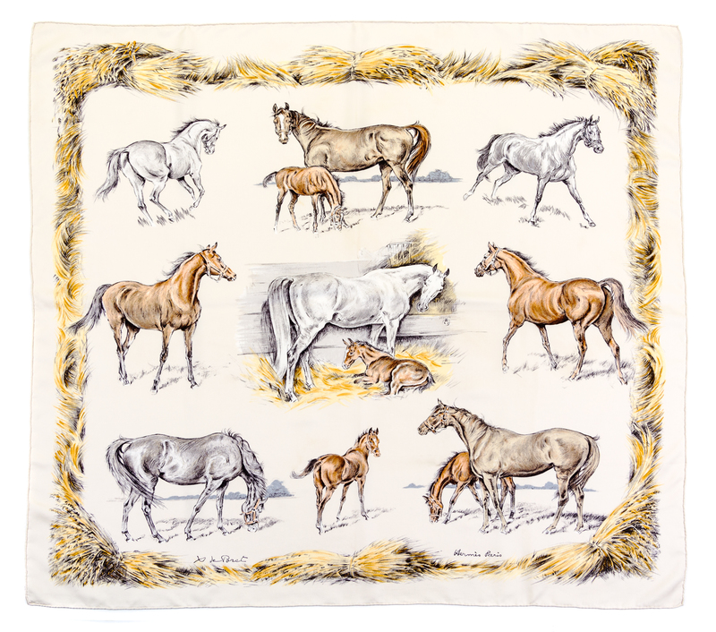 "Les Poulains" pattern, designed by Xavier de Poret. Together with a box.Labeled within the print: Hermes.