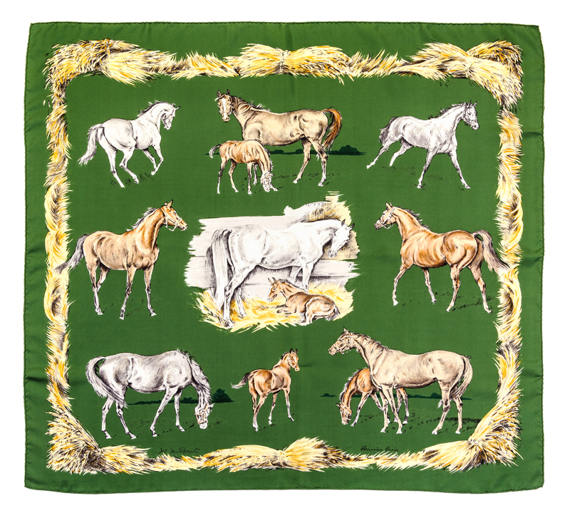 "Les Poulains" pattern, designed by Xavier de Poret. Together with a box.Labeled within the print: Hermes.