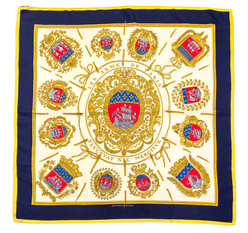 "Les Armes de Paris" pattern, designed by Grygkar Carre. Together with a box.Labeled within the print: Hermes.