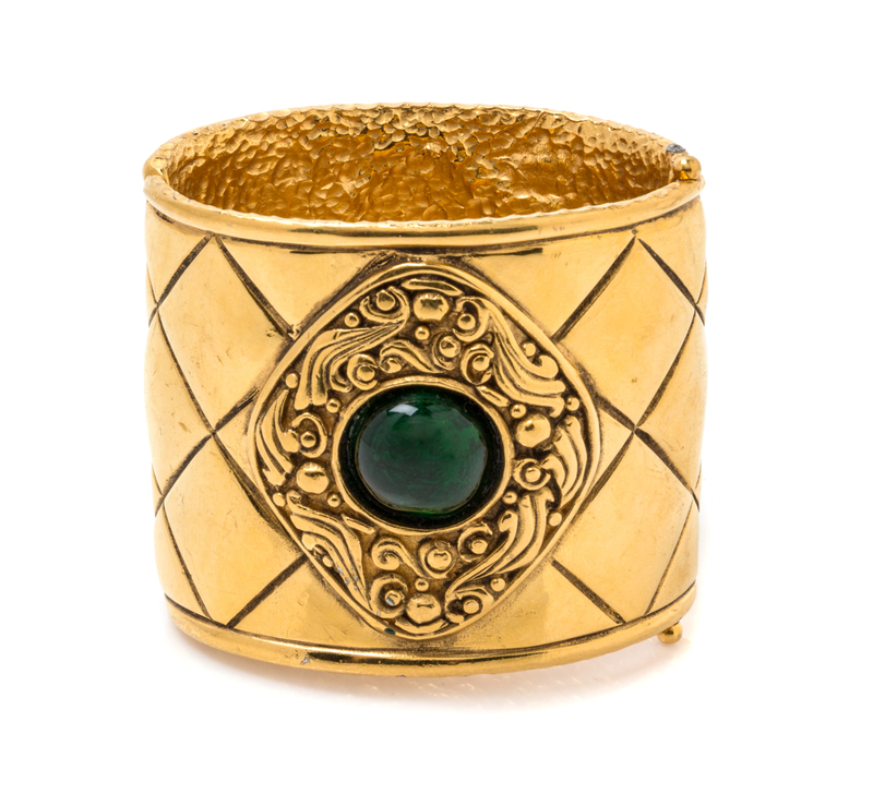 with a quilted pattern motif, a green glass center stone and a hinge closure.Stamped: Chanel.