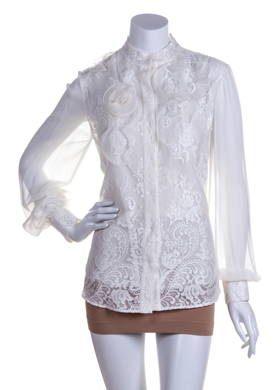 with long sheer sleeves, lace detail and front snap closure, together with a cream camisole.Labeled: Oscar de la Renta.