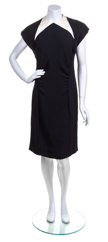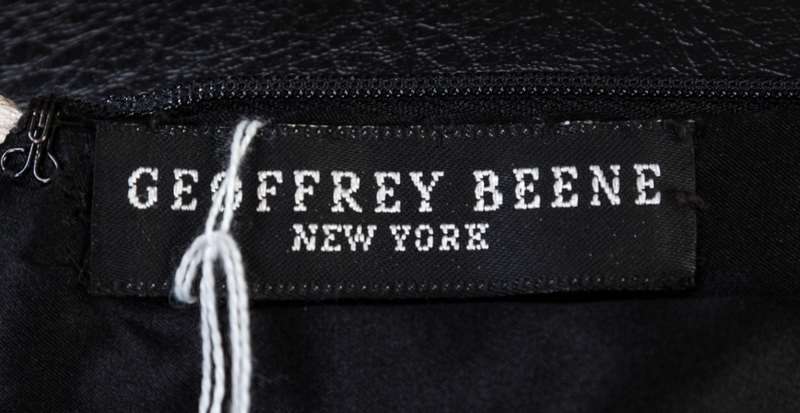 with cap sleeves , a cream geometric embellishment at the neckline and a back zip closure.Labeled: Geoffrey Beene.