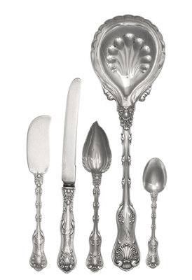 Imperial Queen pattern, comprising:6 fruit knives10 butter spreaders3 citrus spoons11 demitasse spoons1 serving spoon