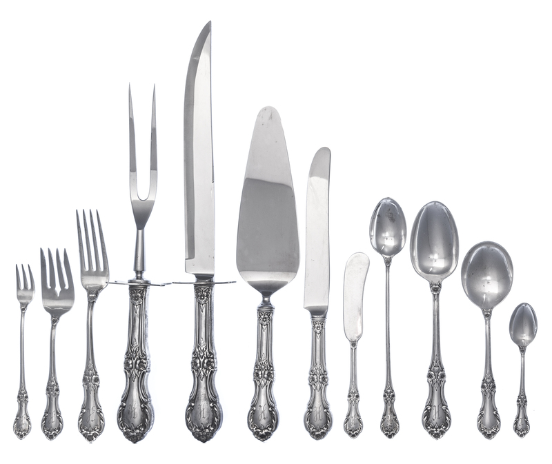 Wild Rose pattern, comprising: 12 dinner knives8 dinner forks8 salad forks6 table spoons1 teaspoon3 soup spoons13 iced tea spoons17 cocktail forks10 butter spreaders5 demitasse spoons1 baby spoon1 lemon fork1 pie server1 carving fork and knife set