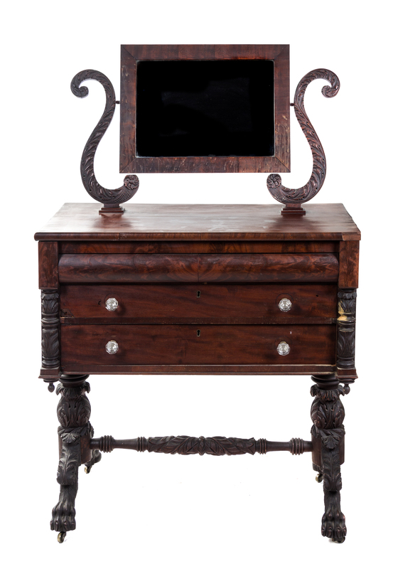 the rectangular top surmounted with a mirror flanked by carved scrolls, above an ogee frieze over two long drawers, raised on two supports with carved leaf and paw decoration, joined by a stretcher.