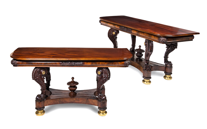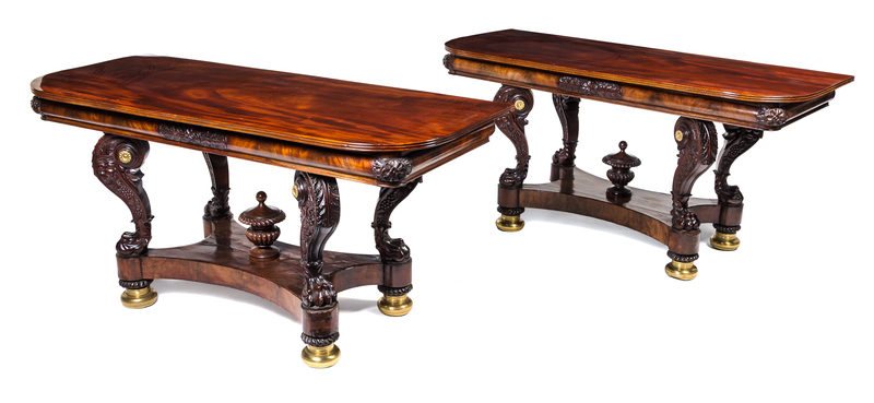 A Pair of American Classical Carved and Brass-Inlaid Mahogany Console Tables