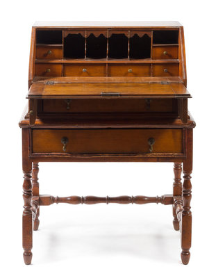 in two parts, the superstructure with a fall front writing surface opening to a fitted interior above a single drawer, the base fitted with a single drawer, raised on turned legs joined by stretchers.