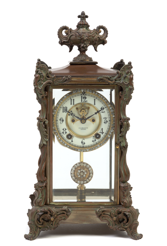 the handled urn form finial above a circular dial with Arabic numeral hours, the dial and pendulum encrusted with rhinestones, set within the case having foliate and C-scroll decoration, raised on scroll feet.
