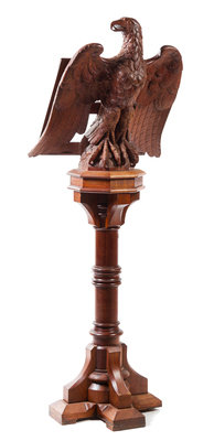 the music rack mounted to the back of an eagle with wings spread, raised on a ring turned standard terminating in a quadripartite base.