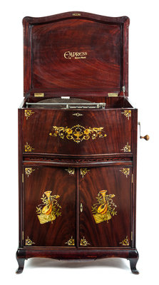 the mahogany case with decal decoration, the rectangular lid opening to the mechanism playing 18 1/2 inch discs on two combs, the case further set with two doors opening to a disc storage compartment; with twelve discs.