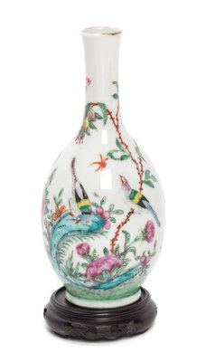 of ovoid form with a slender neck, depicting birds, butterflies and floral blossoms throughout.
