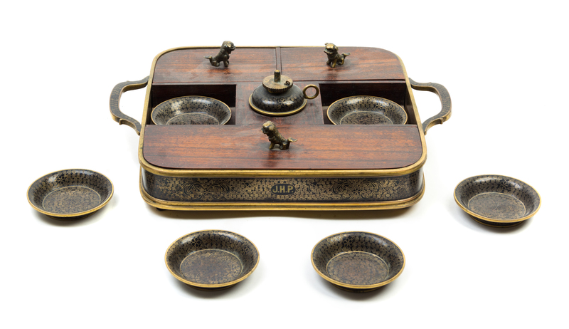 A Chinese Export Cloisonne Mounted Rosewood Smoking Tray