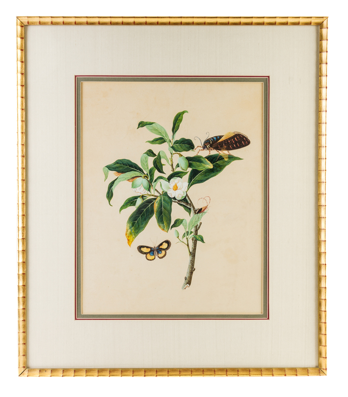 executed in watercolor and gouache, depicting two butterflies and a grasshopper on a flowering branch, matted and framed.