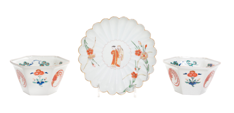 comprising two six-sided cups, together with a plate of chrysanthemum form centered by a courting couple.