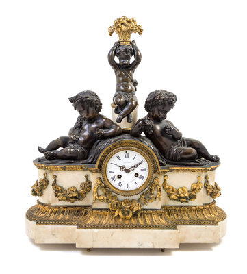 A French Gilt and Patinated Bronze and Marble Figural Mantel Clock