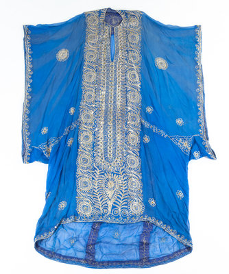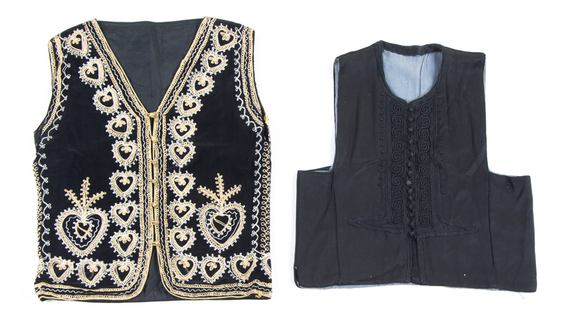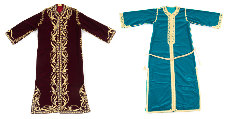 each with gold thread, one teal and the other maroon, together with a similarly decorated thawb and two men's vests.