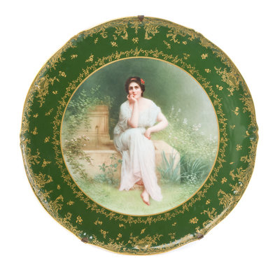 painted to show a robed lady seated before a fountain in the manner of William-Adolphe Bouguereau, having a green border with transfer printed gilt highlights.