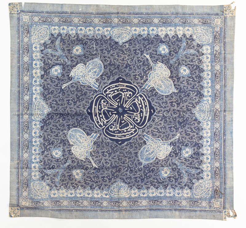 the square panel worked to show arabesques, Kufic script and four tughras all on a blue ground.