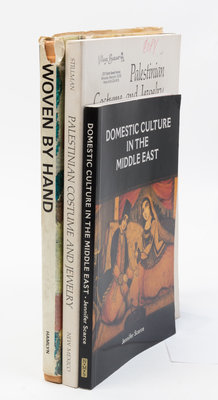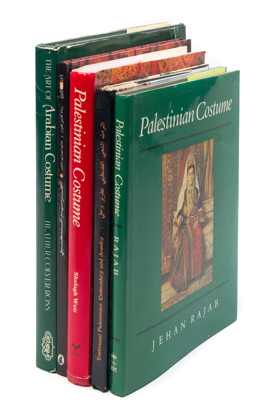 comprising The Art of the Arabian Costume, by Heather Colyer Ross; Woven by Hand, by Ramses Wissa Wassef; Palestinian Costume, by Shelagh Weir; Palestinian Costume and Jewelry, by Yedida Kalfon Stillman; Traditional Palestinian Embroidery and Jewelry, by Abed Al-Samih Abu Omar; Palestinian Costume, by Jehan Rajab; Domestic Culture in the Middle East, by Jennifer Scarce; and Palestinian Embroidery, in Arabic script.