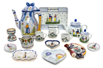 comprising a demitasse partial tea service with a teapot, a creamer, a covered sugar, two cups, two saucers and a rectangular serving tray, together with a coffee pot, two heart-shaped plates of various sizes, an egg cup, a two handled sugar, two Christmas medallion ornaments and two shaped oval plates; 17 items total.