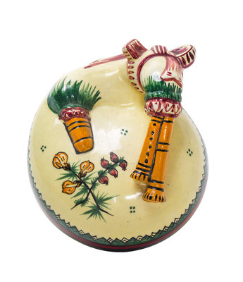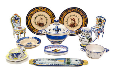 comprising two display plates depicting a lady or a gentleman, an ashtray, a handled bowl, a small covered tureen, a pitcher having a reticulated neck, a shaped oval form dish, a dish cover, a wall ornament, an egg cup with an attached underplate and two chair form covered boxes; 12 items total.