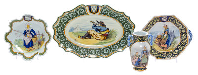 comprising a handled vase painted to show two peasant women and a floral spray, together with three serving plates of various sizes with figural scenes.