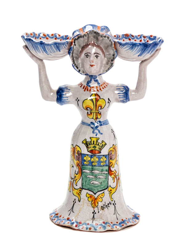 depicting a peasant woman carrying two vessels, her dress bearing a fleur-de-lis and a coat of arms to the bodice.