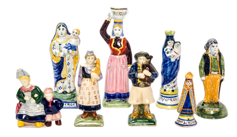 comprising two examples depicting peasant women, one figural group depicting a mother and child, two of the Virgin and Child, one of a man playing a bagpipe, one of a peasant man titled Yannik and one of Notre Dame du Roncier.