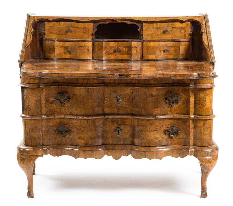 the rectangular top over a slant front opening to a fitted interior above an undulating case enclosing four graduated long drawers, raised on cabriole legs.