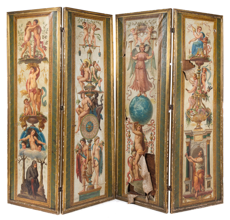 A Continental Painted Canvas Four-Panel Floor Screen