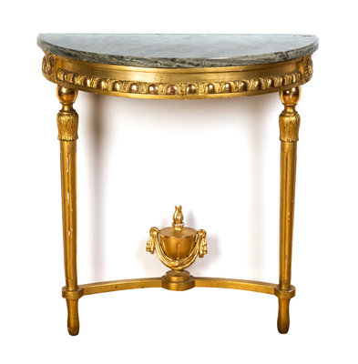 having a demilune marble top over a carved frieze, raised on tapering legs joined by stretchers centered with an urn.