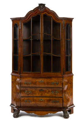 in two parts, the superstructure with a domed cornice above two glazed doors opening to a shelved interior, the base of bombe form and set with three drawers, the whole raised on carved claw and ball feet.