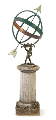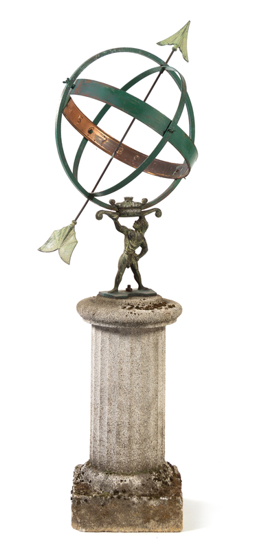 the sphere supported by a figure of Atlas, raised on a cast stone columnar pedestal.