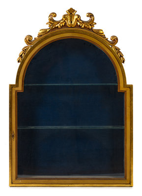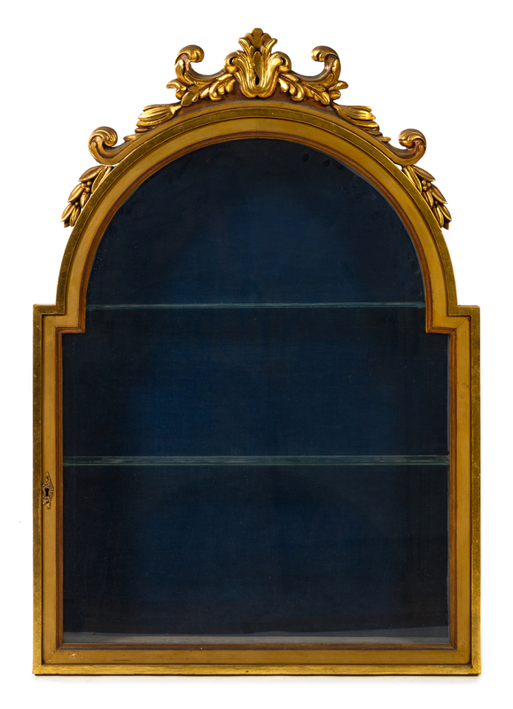 the domed case with a carved foliate crest over a glazed door opening to shelves.