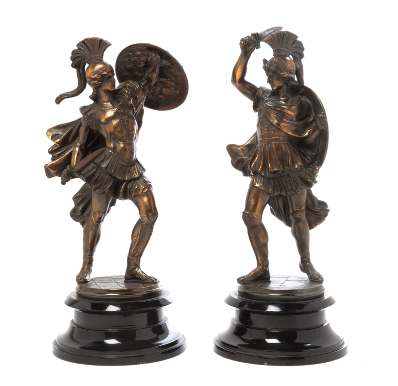 possibly bronze, depicting dueling gladiators on circular bases.