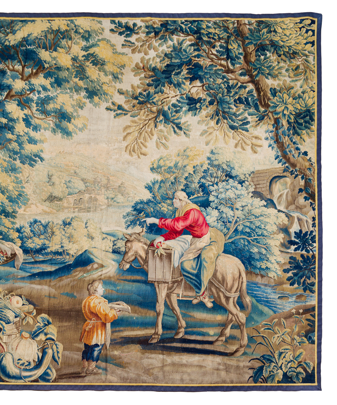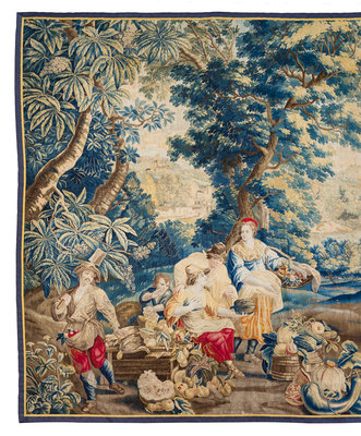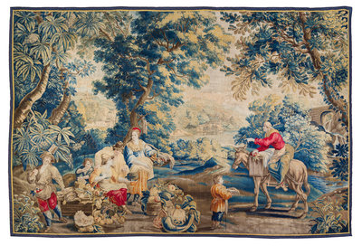 Les marchands des quatre saisons, depicting fruit and vegetable sellers in a wooded landscape, having a river and a village in the background within a blue selvedge.