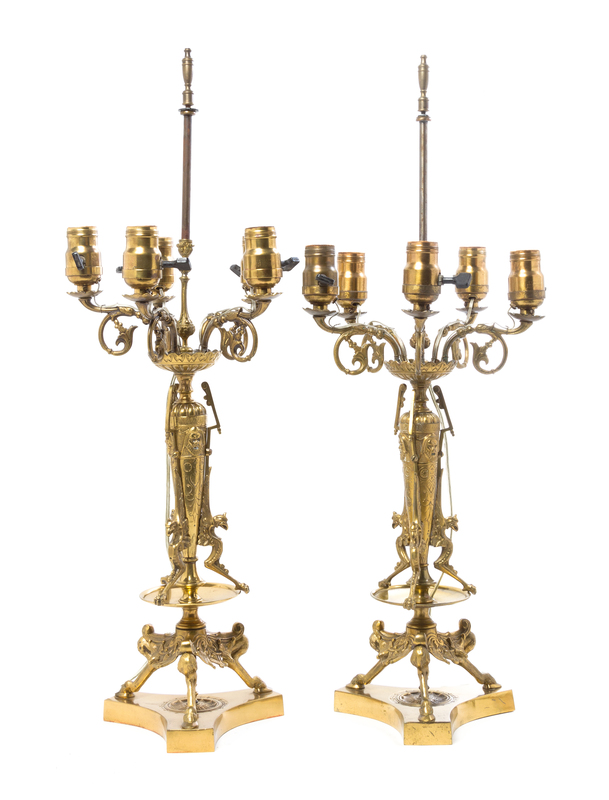 each with masks, griffin monopodia and a tripartite base with bent legs terminating in hoof feet, mounted as lamps.