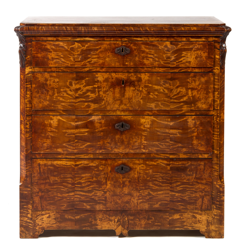 the rectangular top with canted corners having acanthus carved decoration above four graduated drawers, raised on a bracket base.