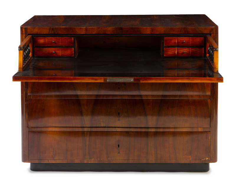 having a rectangular top with rounded corners over a conforming case enclosing a drop front door opening to a fitted interior, over a series of three drawers, raised on a plinth base with rounded corners.