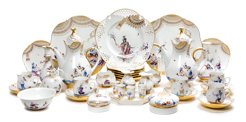 in the Arabian Nights pattern, comprising two coffee pots, two vases, twelve dessert plates, twelve teacups, twelve saucers, two covered boxes, five demitasse cups, a creamer, two small vessels, two sugar bowls, a waste bowl, a serving plate and three serving trays of various sizes, each with crossed swords mark in underglaze blue to the underside; 58 items total.