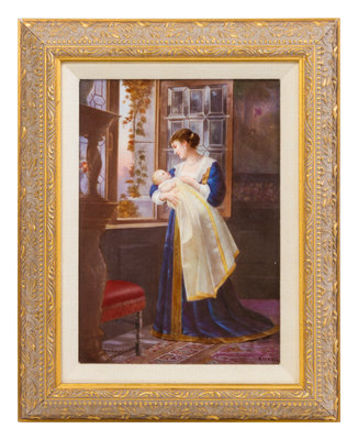 painted with a mother holding her child by a window and signed Knoillez, with impressed K.P.M. and scepter marks and an underglaze blue beehive mark.