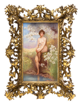 depicting a nude in a landscape after Norman Prescott Davies, signed O. Dietrich, titled The Spirit of the White Petals on the reverse and set in a rococo style giltwood frame, the plaque with an impressed K.P.M. and scepter mark.