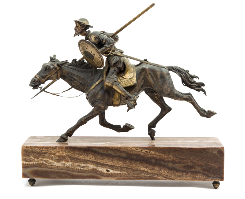 depicting Don Quixote charging forward, signed Bronzes de Arte Zumel at the back, raised on an onyx base.