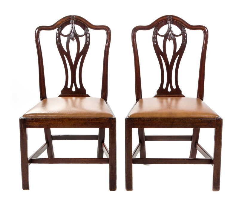 each with a lobed crest rail above a pierce carved vertical splat and a trapezoidal seat, raised on square legs joined by stretchers.