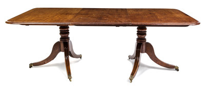 the rectangular top having rounded corners and a molded edge above two turned baluster supports, each raised on a tripartite base with reeded splayed legs terminating in brass hairy paw feet and casters, with three leaves.
