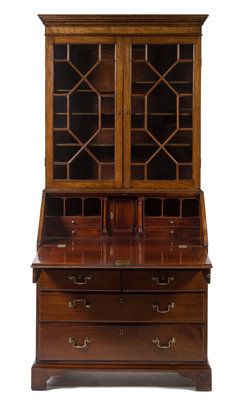 in two parts, the superstructure having a molded cornice above two doors opening to shelves over a drop-down writing surface opening to a fitted interior, the lower section with three graduated drawers, raised on bracket feet.